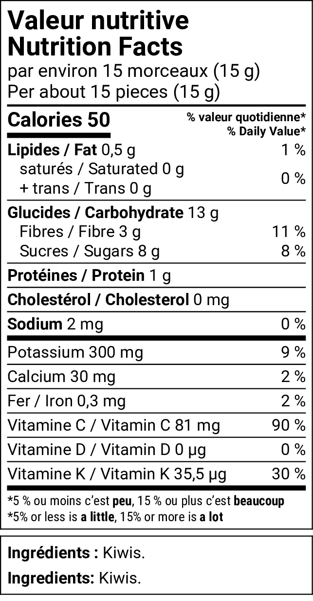 Découvrez nos délicieux morceaux de kiwis lyophilisés ! Croquants, acidulés et rafraîchissants, ils préservent toute la saveur et les nutriments du fruit frais, sans aucun ajout. Parfaits pour une collation santé, à savourer seuls ou dans vos recettes préférées !